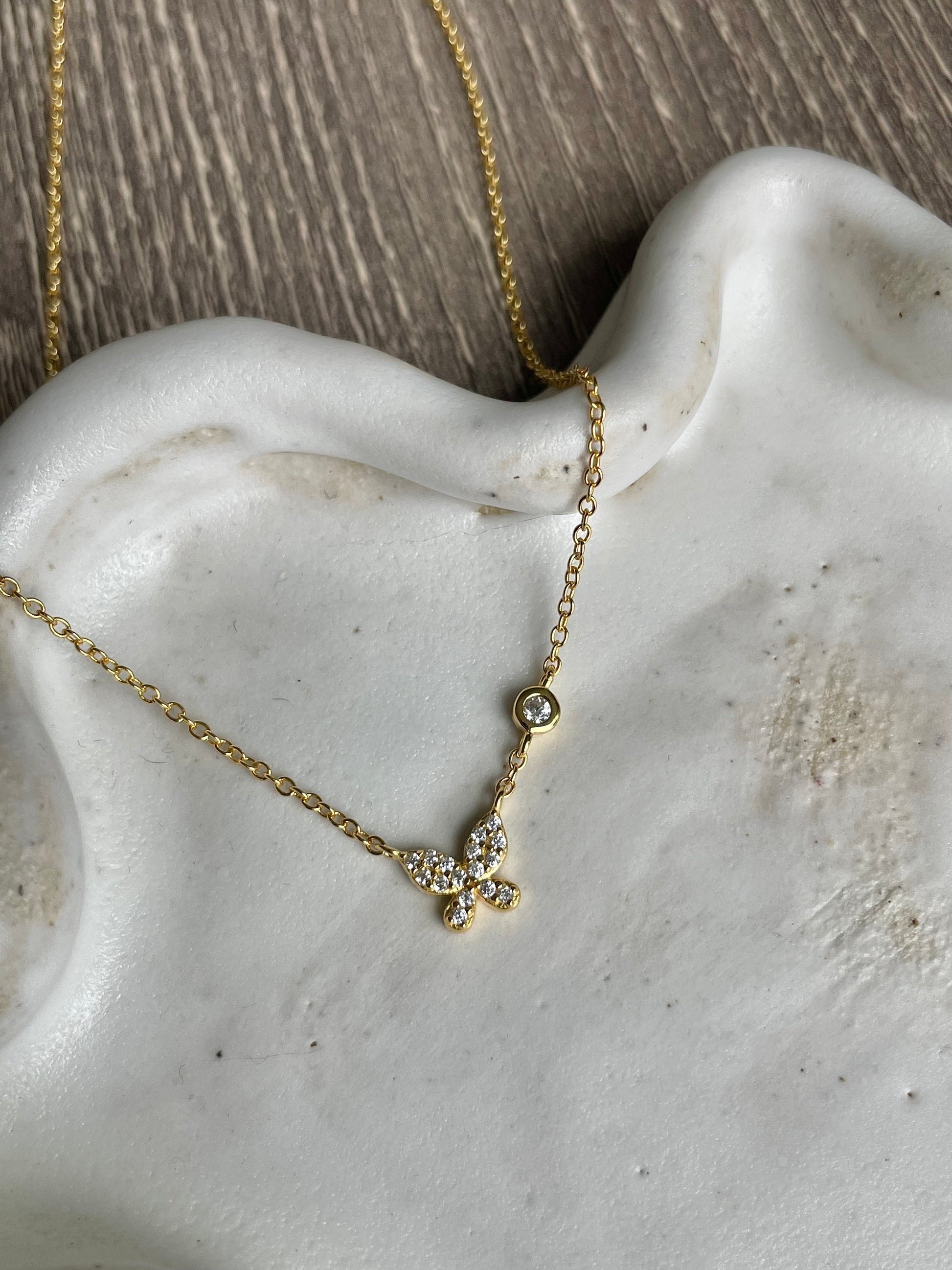 This necklace features a dainty butterfly charm and a gem on the side for an extra sparkle. It is the perfect everyday necklace!